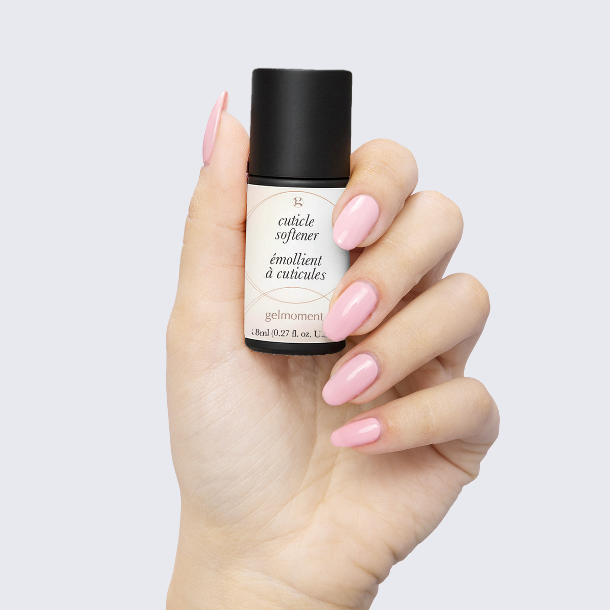 Start with clean, dry hands. Apply cuticle softener to cuticles and let sit for 1-2 minutes. Gently push cuticles back with gelmoment cuticle pusher and remove excess skin. Do not use force; cuticles should slough off easily. If necessary, remove excess with gelmoment cuticle nippers.